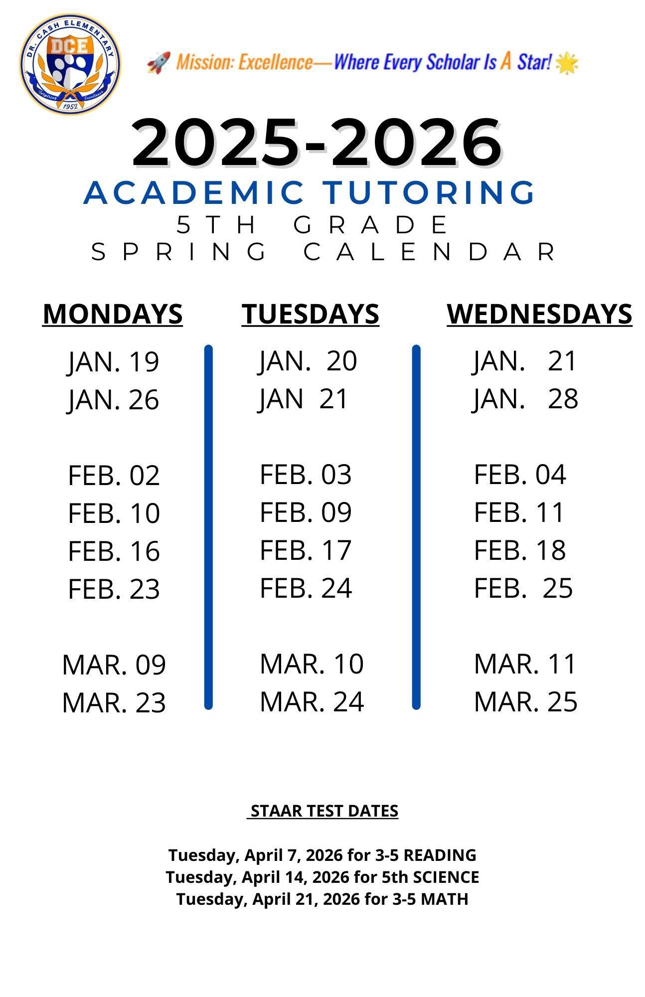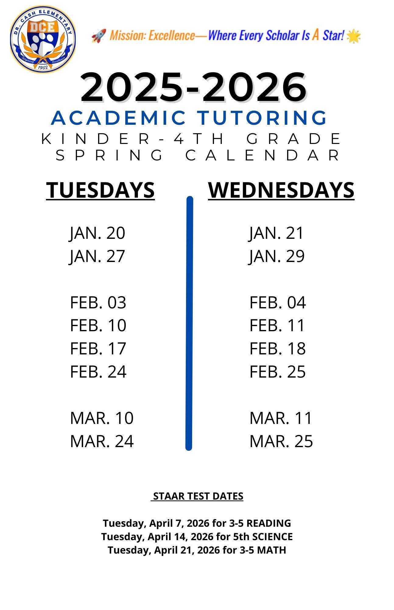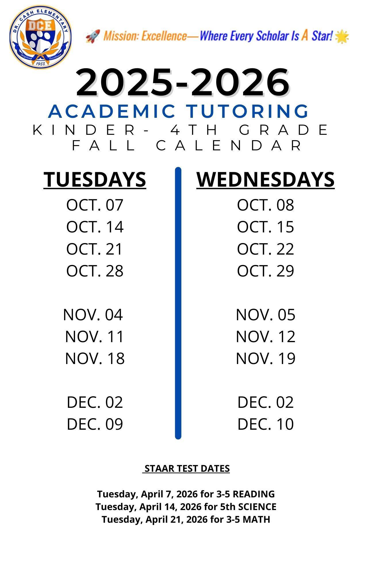 Tutorial Schedule 25-26 Tutoring Begins Next Week! Please review the tutorial schedule below and connect with your scholar’s teacher for any updates. 5th Grade: Monday–Wednesday, 3:30–4:30 p.m. Other Grades: Tuesday–Wednesday, 3:30–4:30 p.m. We kindly ask that students arrive on time, as our staff also have families to return home to. Thank you for your support! Published October 2, 2025 Print